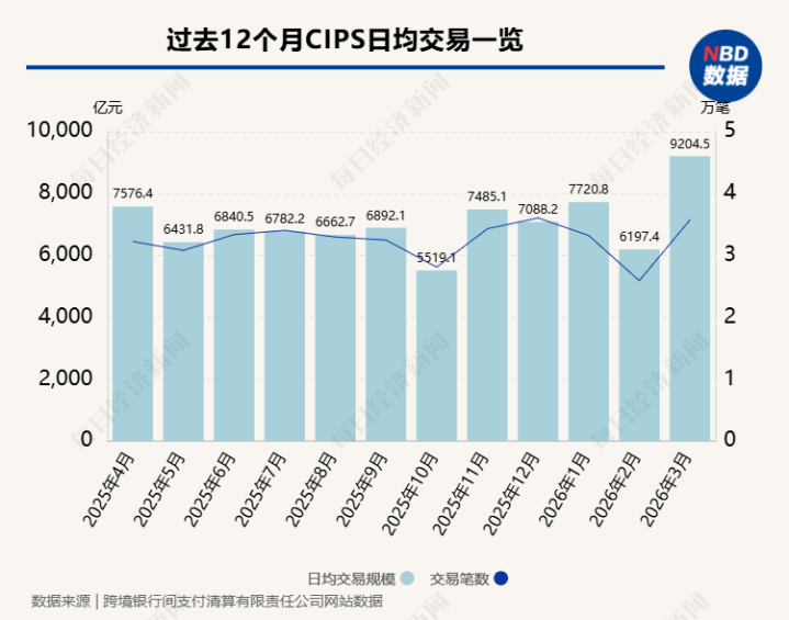 与此同时,人民币的支付地位也显著提升。3月,人民币跨境支付系统(CIPS)日均交易额达9205亿元,创过去12个月以来最高,并且在4月2日,单日交易额进一步升至1.22万亿元。
