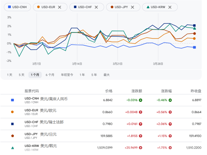 在截至4月3日的一个月中,美元指数阶段性走强,欧元、加元、瑞士法郎、日元和韩元等发达经济体货币普遍承压。其中,韩元对美元汇率一度跌破1530关口。日元汇率非常疲软,在3月27日跌破160整数关口。即便是传统的“避险货币”瑞士法郎,也未表现出明显的优势,对美元汇率下跌了2.06%。